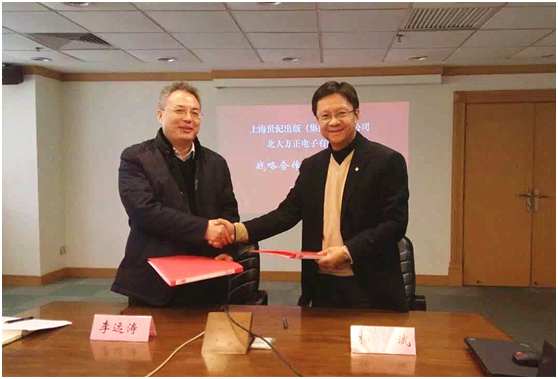 方正電子董事長、總裁楊斌(右)和世紀(jì)出版集團副總裁李遠(yuǎn)濤(左)代表雙方簽約