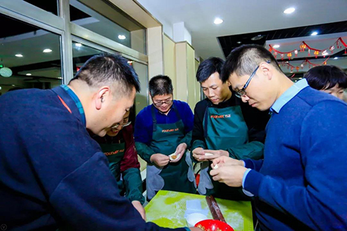 總結(jié)會(huì)當(dāng)天恰逢小年,會(huì)議結(jié)束后大家一起歡聚在員工餐廳,揉面團(tuán)、搟面皮、包餃子……在一片歡樂祥和的氣氛中歡度小年,喜迎新春。